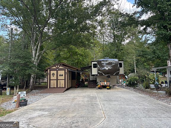 This cabin is a WOW! The Solitude 5th wheel is not included but does give you an idea on how your RV can fit on the lot. This cute cabin has been recently renovated with new plank style flooring, new cabinetry in the kitchen and bath, plus sink, refrigerator, microwave, washer/dryer, TV, residential toilet, draperies, unique fans with lights and a remote dimmer, plus grass turf on the concrete patio. There are wood walls, a vaulted wood ceiling and ship lap was added on a wall to give it a real cabin feel! The exterior of the cabin has a metal roof, storm covers for all the windows plus an awning for shade! It has a nice level lot with room to play outdoor games in the backyard space and room to add a firepit and etc. Lots of concrete driveway and a pad for your RV with ample space to park 4 vehicles! A new taller decorated 8X10 storage building is there with a ramp to fit a golf cart, bike, extra storage/ or workshop for your needs. You'll create a lifetime of memories here, whether you're relaxing, fishing, or participating in the ongoing activities within Paradise, a gated community. Enjoy the pool, pavilion, clubhouse, and planned activities! The location is central to all the fun in nearby mountain towns and events, just minutes from Cleveland, Helen, Dahlonega, Clarkesville, and Blairsville. Shop, dine, fish, hike, and visit vineyards-the possibilities are endless! Please note that Paradise is a vacation resort community that does not allow full-time living. The listing agents are owners in Paradise, so feel free to call for a tour or more detailed information about Paradise and this property.