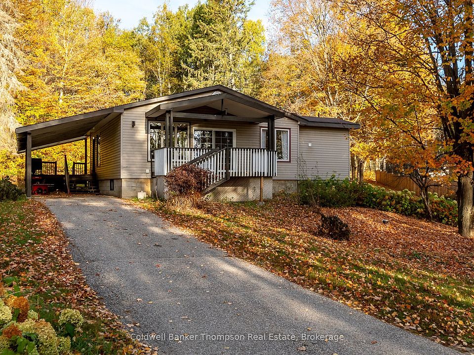 This charming bungalow blends comfort, convenience & great potential in a peaceful setting. The main floor features an open-concept kitchen, dining & living area, perfect for everyday living or entertaining. The updated kitchen offers plenty of cabinetry & counter space, while sliding doors from the living room open to a covered front deck where you can unwind & enjoy the outdoors. The primary suite includes an updated 3-pc ensuite with a step-in shower & handy laundry facilities, adding thoughtful functionality. A good-sized guest bedroom & a 4-pc bath complete the main level. Downstairs, the lower level offers excellent potential with a separate side walkout entrance, a cozy woodstove & a nearly finished 3rd bedroom, just waiting for ceiling completion & flooring. Outside, the property features a generous yard with space for kids to play or for green thumbs to garden, plus a carport & a covered side deck offering more sheltered outdoor space. Practical features include a drilled well, septic system & fibre optic internet for modern connectivity. Located on a municipally maintained year-round road with curbside garbage, recycling & green bin collection, this home makes rural living easy. Commuters will appreciate quick access to Hwy 11, while outdoor adventurers will love the proximity to snowmobile trails & endless opportunities for seasonal recreation. With its welcoming layout, updated features & room to grow, this bungalow is ready for new owners to make it their own & enjoy all it has to offer.