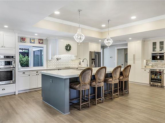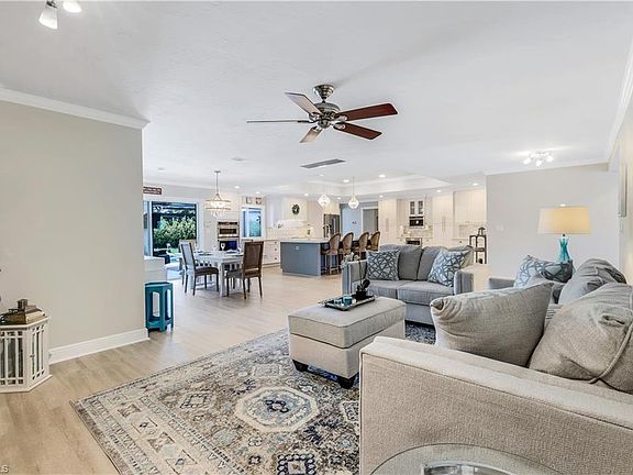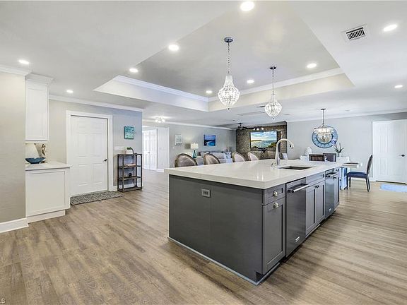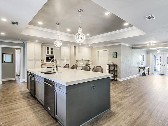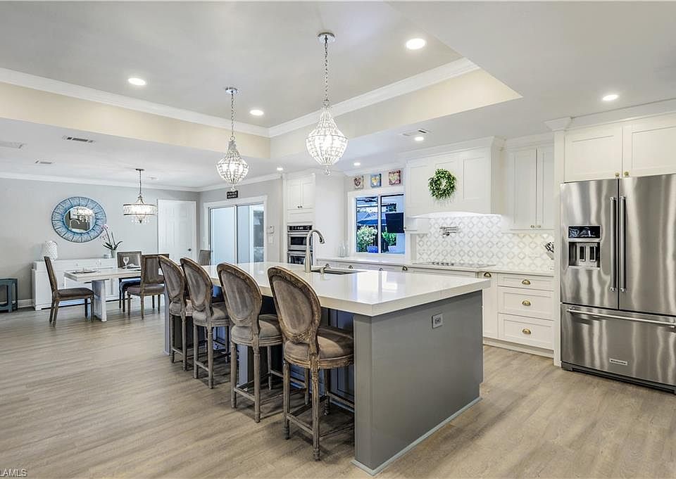 NO RENTAL RESTRICTIONS! NO HOA! Nestled on a quiet circle at the back of a peaceful neighborhood with no through traffic, this exquisite 4 bedroom plus den (den has a closet so it can be used as a bedroom), 3 bathroom home offers the perfect blend of modern luxury and tranquil living. Designed with an open floor plan, this residence ensures a seamless flow throughout its spacious interiors, ideal for both everyday living and entertaining. The centerpiece of the home is the stunning new kitchen, boasting top of the line KitchenAid appliances, quartz countertops, ample cabinetry, a built in JennAir Coffee station, and two dishwashers, making it a chef's delight and perfect for coffee enthusiasts and large gatherings. The split-bedroom layout ensures privacy, with a very secluded IN LAW SUITE perfect for guests, or extended family stays. Every inch of this home has been thoughtfully updated, including luxury vinyl flooring throughout, ensuring durability and style. The property is fully hurricane protected, offering peace of mind during stormy season. Step outside to your private oasis. The newly landscaped yard complete with an updated irrigation system sourced from a well, ensures lush, green surroundings year-round. The fenced in yard provides a safe haven for children or pets, while the concrete pad is perfect for parking your boat or R.V. Enjoy year round swimming with the brand new pool heater and state of the art Aqualinks system, ensuring that your pool is always ready for a dip! The garage is a homeowners dream, featuring a custom workbench and HUSKY cabinets, providing ample storage and workspace for all of your projects. Location is key, and this home does not disappoint. Just 3.5 miles from the pristine beaches and the vibrant Mercato, you'll have access to shopping, dining, and entertainment options. I 75 is just a couple miles to the East for easy access to RSW. Additional features include a circular driveway, enhancing curb appeal and providing ample parking spaces. The property is a rare find, offering a unique combination of luxury, privacy, modern amenities and a prime location. BE SURE TO CLICK ON THE VIRTUAL TOUR!