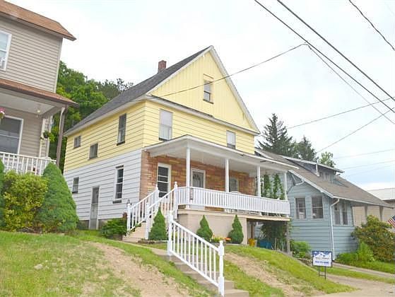 Starter home, has view of city, nice front porch, back deck and garden on upper lawn. 3 bedrooms, 1-1/2 baths, usable walk-up attic could be 4th bedroom. Eat in kitchen, nice large family room addition on back.