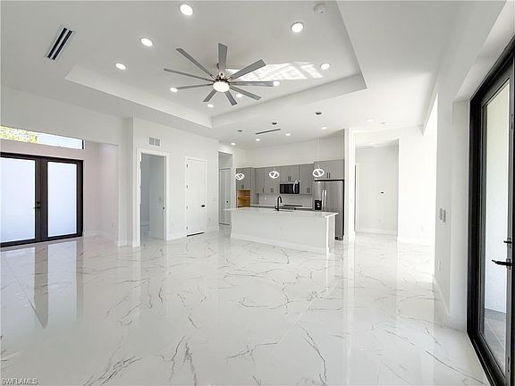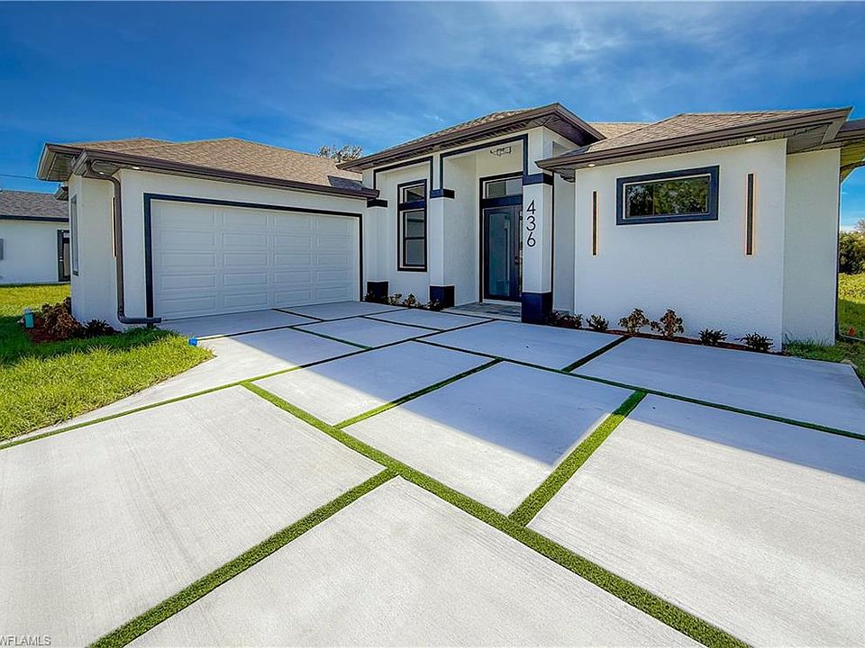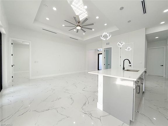Move-in ready New Construction home in Lehigh Acres with over 1,800 sq ft of living area! This modern property offers 3 bedrooms plus a den, 2 bathrooms, and a spacious 2-car garage with a side-entry layout that creates a clean and open front elevation. The custom driveway with turf accents and modern exterior lighting gives the home standout curb appeal the moment you pull in. Inside, the home features an open floor plan with polished 24x24 tile flooring throughout, high ceilings, recessed lighting, and a large designer fan in the main living area. The kitchen includes quartz countertops, stainless steel appliances, soft-close shaker cabinets, pendant lighting, and a large island with plenty of room for cooking, prep, and casual seating. Natural light fills the home, giving each room a bright, fresh feel. The primary suite offers a stylish and comfortable retreat with dual vanities, a wide mirror, a glass-enclosed walk-in shower, and beautiful stone-look tile finishes. The guest bathroom carries the same modern materials for a seamless look throughout. The covered lanai offers two ceiling fans and plenty of space to lounge, dine outdoors, or enjoy peaceful mornings. The home also includes a laundry room with upper cabinets and a sink, impact windows and doors for safety and efficiency, and quartz countertops throughout. A full sprinkler irrigation system is installed to help keep the lawn looking great year-round. This property is brand new, fully complete, and ready for its first owner to move in without any work needed. Located near SR-82, shopping, dining, schools, FGCU, and SWFL International Airport, this home is positioned in a fast-growing area of Lehigh Acres. It’s an excellent option for buyers looking for a modern home with upgrades, low maintenance, and plenty of space to enjoy the Florida lifestyle.