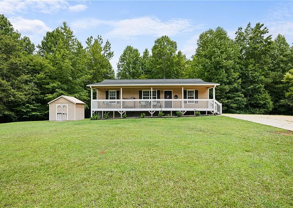 Adorable, move-in ready Ranch featuring 3 bedrooms and 2 bathrooms on 1.3 acres! Newer roof, newer A/C, newer water heater, updated light fixtures, newer blinds, updated hardware, newer carpet in bedrooms, updated bathrooms, newer appliances, refrigerator and washer/dryer included! Enjoy your favorite drink on the rocking chair front porch that leads to open floorplan. The family room featuring a wood-burning stove is the heart of the home. Updated kitchen with newer stainless steel appliances, tile backsplash with eat-in kitchen leads to laundry room. Split bedroom floorplan. Relaxing primary suite features updated ensuite and closet system. Additionally, there are two secondary bedrooms with fantastic closet space and updated full bath. Enjoy an evening by the firepit overlooking the lush, vast backyard. Private covered deck and storage building. No HOA!