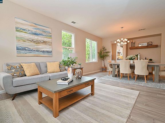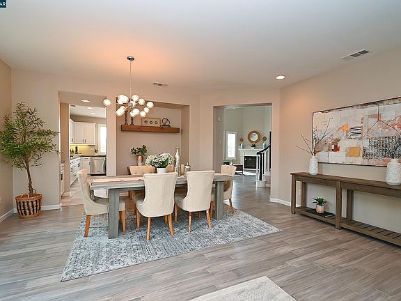 Nestled in a serene court in the desirable Waters End community, this home offers the perfect blend of comfort and luxury! It boasts an elegant formal living/dining room, gourmet kitchen with island, family room with fireplace and den. The winding staircase leads you to the four bedrooms and laundry room. Step into luxury in the spacious primary suite with a large walk-in closet, recently updated bathroom with high-end finishes that include Hansgrohe fixtures, Robern mirrors, quartz surfaces, soaker tub and frameless 1/2" shower glass. Step outside to an expansive flat backyard with mature fruit trees providing a generous supply of your very own fruit- enough to share with friends and neighbors! The backyard is perfect for gardening, outdoor gatherings and relaxation. If desired, the paved side yard can be converted for RV parking. While private and nestled away from busy roads, this home is in close proximity to the major freeways, SF Bay Ferry terminal, Napa, Marin, East Bay and San Francisco. Additionally, Waters End park and hiking trail are just a block away- perfect for families with kids and pets. Other benefits of this home include paid off solar panels, vaulted ceilings, 3-car garage, den and Benicia school district. Welcome Home!