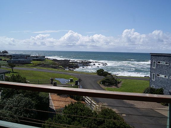 Dramatic, gorgeous ocean view Condo within City of Yachats. Architecturally designed with upscale interior finishes - maple flooring, Berber carpet, tiled and rock fireplace, gourmet kitchen with cabled lighting and granite counter tops, beautiful and colorful tiled bathrooms. Master bath has large whirlpool jetted tub and separate shower. Wrap around decks and lots of windows to welcome views of rocky shoreline boasting dramatic wave action. Upper West facing unit has perfect views of Yachats Village, ocean and Yachats Bay. Dedicated parking space in addition to garage. This would make perfect full time home, 2nd home or Vacation Rental. Condo comes fully furnished as seen in photos.