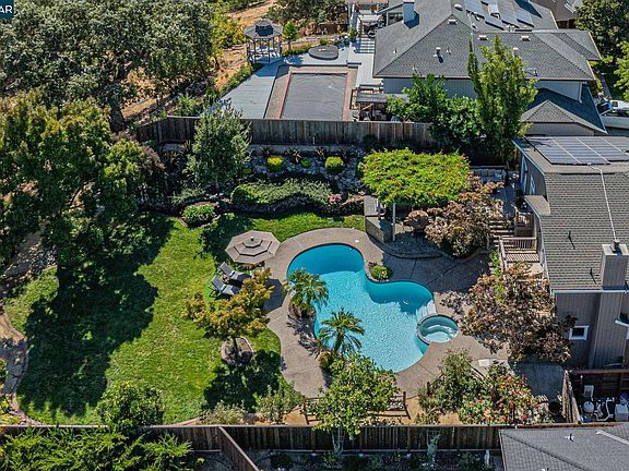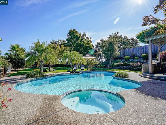 Paradise in Pleasant Hill! Experience resort-style living in this contemporary home on an oversized lot with stunning views. Enjoy warm summer evenings dining alfresco on your private patio with a built-in BBQ, overlooking a park-like backyard with a pool and spa. Meander through beautiful gardens, fruit trees, and take in the Mt. Diablo views. The reimagined chef's kitchen features 10' ceilings, a Wolf range, custom cabinetry, and lovely backyard vistas. Entertain effortlessly in the open-concept living and dining area, showcasing elegant white oak floors and modern upgrades. The primary suite offers a relaxing soaking tub and a private balcony with scenic views. A versatile lower-level room can serve as a home office or secondary bedroom, with a full bath for convenience. Situated in a unique double cul-de-sac, this home offers a safe environment for outdoor play. Additional highlights include a 3-car garage with overhead storage and EV charging. Located in the sought-after Valley High neighborhood, you're close to trails, parks, K-12 schools, DVC, and a variety of dining and entertainment options. Come make this your home! OH 10/1 10am-12:30pm