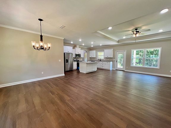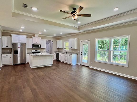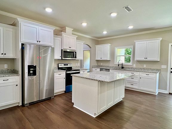 Beautiful 3bed/2ba new home located in Geneva AL. Great floor plan w/ split bedroom layout! Open floorplan w/ kitchen overlooking the living room area! Granite countertops, custom cabinets, stainless steel appliances and pantry. Living room has tray ceilings, celiling fan, and gas fireplace w/ mantle! Kitchen and living room have great lighting and over looking the backyard and wooded area. Crown molding! Master suite features tray ceilings, double sinks, shower, huge walkin closet and connection to the laundry room! Covered backporch has iron railings, ceiling fan and great view of back yard. 2 car garage w/ extra interior storage room. Natural gas fireplace and water heater. Range is electric but there is gas hook up run to the range.