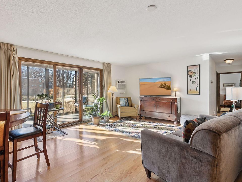 Sunny walk-out 2 BR condo in the demand 4360 Brookside building. The unit offers beautiful flow and quality updates. Hardwood floors, stainless appliances including Bosch induction stove with convection oven, extra storage with granite countertop. Updated lighting. Beautiful baths including updated 3/4 owner's bath with walk-in shower. Inviting, sunny 3-season porch overlooks yard and includes sunblock curtains for optimum use in all seasons. A charming area in which to relax. Two newer wall A/C units. Thoughtfully updated and well kept, this unit is a stand out! Enjoy the top-notch amenities of a heated indoor pool, recently renovated large party room, sauna, exercise room and a prime underground heated parking space plus storage. Well run building in a convenient location with large yard and creek. Near shopping and easy freeway access. A quality, convenient lifestyle awaits!
