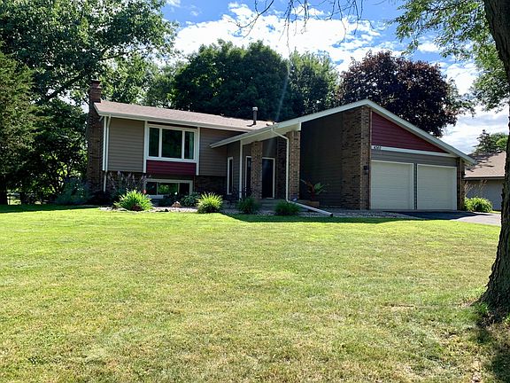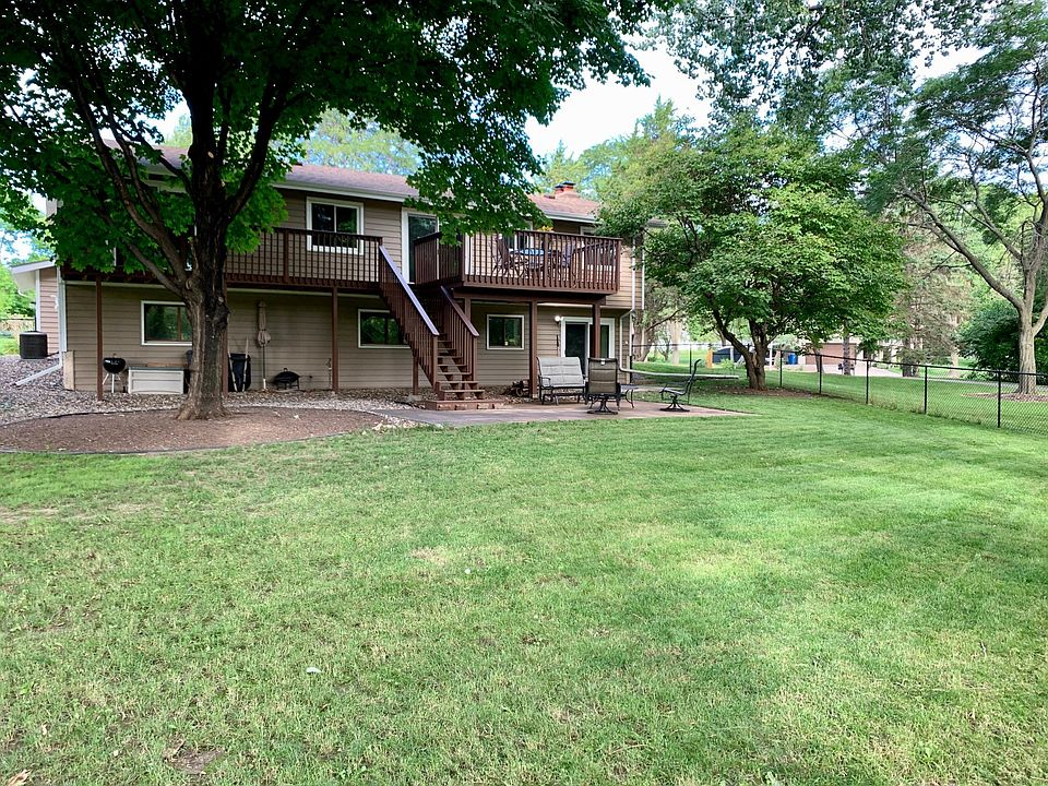 Sure to impress Eagan 4 bedroom 3 bath w/ attached 2 car garage! As you enter the home, notice the french doors and spacious foyer. Main level boasts vaulted ceiling with wooden beams and open concept. Inviting eat-in kitchen with newer patio door to the deck/outdoor living space! Sprawling owner's ensuite w/ tiled shower and floor, dual bowl vanity with quartz top! Enjoy the family room with bar (plumbing roughed in) and the pool table stays! 2 bedrooms fresh clean laundry and recently remodel bathroom completes the walkout lower level! New carpet and pad installed top and bottom on 7/31/20, siding 2019, furnace, water heater, roof & gutters 2015 (by previous owner), fenced in back yard. Must see.