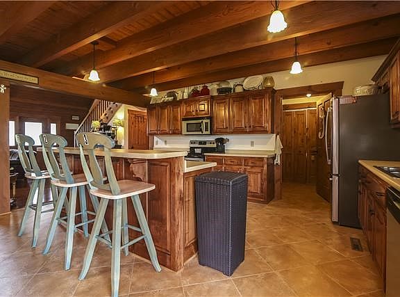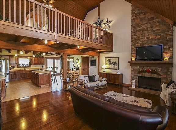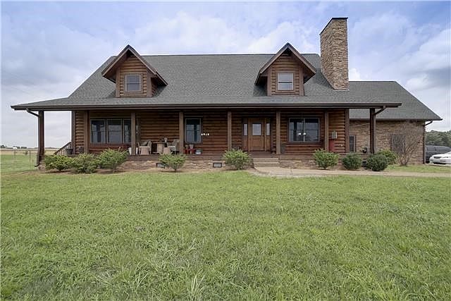 This beautiful log home feature an open floor plan with 20 ft ceiling in the great room that also has a stacked stone wood burning fireplace. The front porch views crop land juxtaposed a tree lined river. The master bedroom is oversized with large master bath and office. This home is handicap accessible with wide halls, doorways, and an elevator giving access with no steps. 13 acres, a barn and gazebo. It welcomes 2 legged and 4 legged residents alike. Close to I65 this would make a good bed and breakfast.