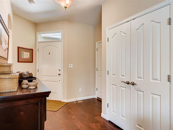 A great find in an intimate community. Over 2700 finished sq ft with upgrades throughout. Extensive rich hardwood floors on the wide-open main level. The owner's suite has vaulted ceiling with fan remote, five-fixture bath with double vanity, soaking tub, oversize shower, and separate water closet. Master closet includes adjustable shelving. Main level includes second bedroom, 3/4 bath with tiled floor and laundry room with utility sink. Gourmet kitchen features granite,42" wood soft close cabinets, stainless appliances including gas range. Spacious great room includes gas fireplace with tasteful stacked stone and mantel, surrounded by windows. A large private, covered side patio is perfect for entertaining. Lower level has an additional bedroom, full bath with tiled floor, expansive multi-purpose room, and abundant natural light. Built-in bookcases and desk. Two car attached garage.