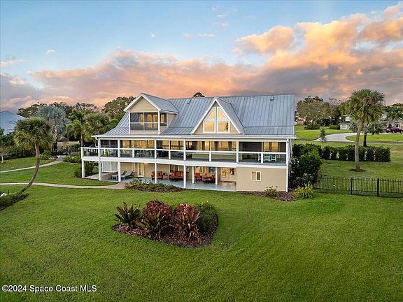 Discover the Essence of Waterfront Luxury on Merritt Island, FL, where refined elegance meets the serene beauty of waterfront living. Set against the breathtaking backdrop of the Island's enchanting landscapes, this extraordinary residence invites you to indulge in a lifestyle defined by opulence, privacy, and unparalleled scenic vistas. Imagine waking up every morning to the gentle lapping of waves and the tranquil allure of your very own slice of paradise on private, storm-protected Honeymoon Lake with deep water access to the Indian River. Every detail of this home has been meticulously crafted to offer the epitome of luxury living. From fully renovated interiors, including all-new impact windows and doors, to the newly renovated custom kitchen perfectly positioned between the extra large dining room and great room. State-of-the-art appliances, marble countertops and backsplashes are just a few of the touches, as well as a full finished basement and 30/50 amp RV power. It's the perfect local for cooking, entertaining, and a marriage of the two. Expect unmatched water vistas from every room and exquisite balconies that cover the entire length of the property, which afford a magnificent sunset view. The inclusion of a finished basement adds an additional layer of versatility and space, perfect for a home theater or a state-of-the-art gym.