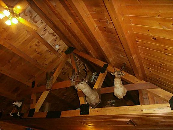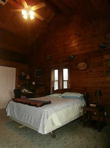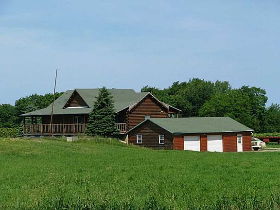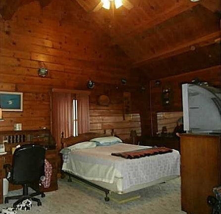 Log cabin with open floor plan and wrap around porch, extra large kitchen and oversized garage. Estate sale.
