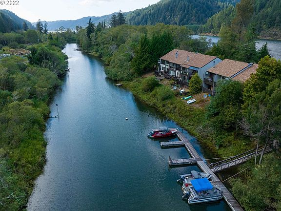 Updated and expanded condo on the Umpqua River. One of the nicest units at Brandy Bar Landing with over 200 extra sq ft added in living room, loft and bedroom. Water views from every room. Slate decks provide outdoor living space. Large deck off of primary bedroom to enjoy the canal, Palm tree and your own boat slip. Tiled walk-in shower in main bathroom. Vaulted living room and loft with sauna! Custom wrought iron work and upgraded ceiling fans throughout. All furniture and appliances included.