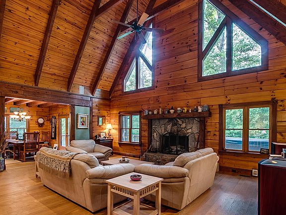 Beautiful secluded setting on 14 acres in Southwest area adjoins Uwharrie River! Custom built log home has many features, 9' ceilings, great room w/vaulted ceiling, exposed beams, stone FP. Kitchen has custom Cherry cabinets & island, formal dining room & office. First floor master suite offers jetted tub & ceramic shower. Upstairs has two spacious bedrooms, bath & bonus room, full basement plumbed for bath, 3 screened porches & wrap around porch w/hot tub, creek, 30x60 workshop/garage. Tons of privacy!