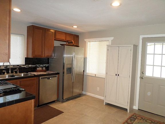 This fresh mid-century home has been completely modernized for pickiest of buyers. New roof, New HVAC system, New double-pane windows, Tile flooring throughout, freshly painted, new kitchen cabinets. granite tile counter tops, glass tile backsplash, stainless steel appliances including gas stove, Microwave, refrigerator and Dishwasher, white stackable washer and dryer in hall. So much storage for this quaint little central home. Mountain views! Close to schools, stores and bus lines. Fresh rock in HUGE double lot that is completely fenced with 2 drive in gates. R-2 zoning makes future building possible.