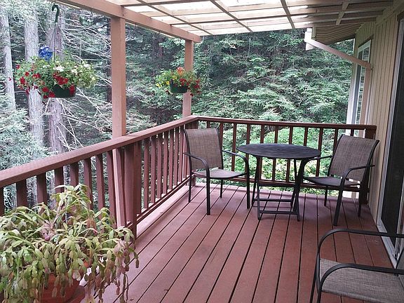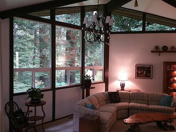 There is a wonderful edge of town feeling in this spacious three bedroom and two bath home. You walk into the entry which opens to the soaring vaulted ceilings of the dining and living rooms. Each room has walls of glass overlooking majestic redwoods, and flora and fauna of the forest. There is a deck off the dining room that overlooks this special setting. The kitchen has a sitting room good for a dinette or for just reading or watching the television. The master bedroom is spacious as well and has a balcony overlooking the green belt. Downstairs is the large third bedroom with its own bath with shower. Off this bedroom is a bonus room currently set up as a workout room. Include the double car garage and the big deck in the front and you have a fine home offering many uses.