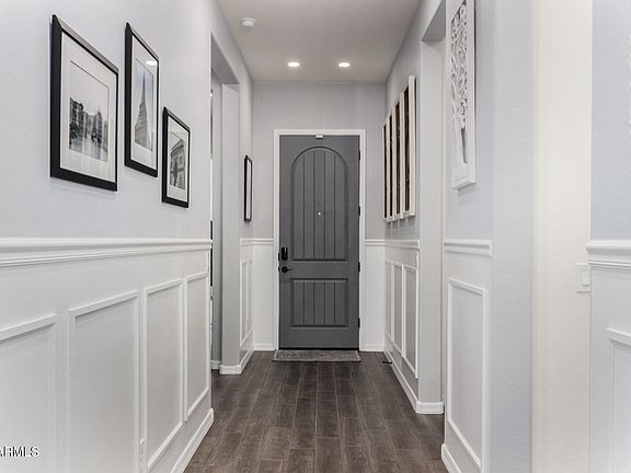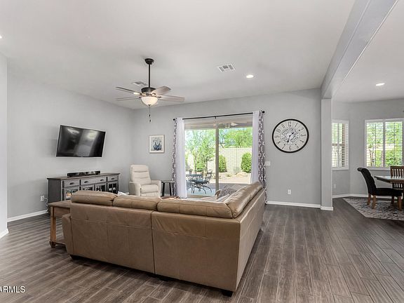 Eastmark Elegance—Upgraded Single-Level Gem Across from the Park! Welcome to your dream home in the heart of Eastmark! This beautifully upgraded single-level stunner offers a rare combination of style, functionality, and location. With 3 spacious bedrooms, a versatile den with French doors, and a thoughtfully designed split floor plan, this home blends comfort with flexibility. Step inside to find wide-plank tile floors, custom wainscoting, two-tone paint, plantation shutters, and surround sound. The gourmet kitchen is an entertainer's dream—massive island, soft-close white cabinets, 5-burner gas cooktop with electric oven, walk-in pantry, bay window dining nook, and farmhouse sink—all under upgraded and recessed lighting. SEE MORE... Eastmark EleganceUpgraded Single-Level Gem Across from the Park! Welcome to your dream home in the heart of Eastmark! This beautifully upgraded single-level stunner offers a rare combination of style, functionality, and location. With 3 spacious bedrooms, a vThe private primary suite features a spa-style walk-in shower and generous closet space. Secondary bedrooms boast plush carpet and nearby linen storage. A security system adds peace of mind.