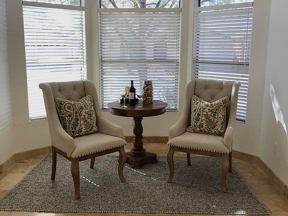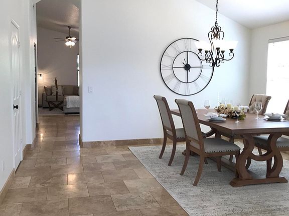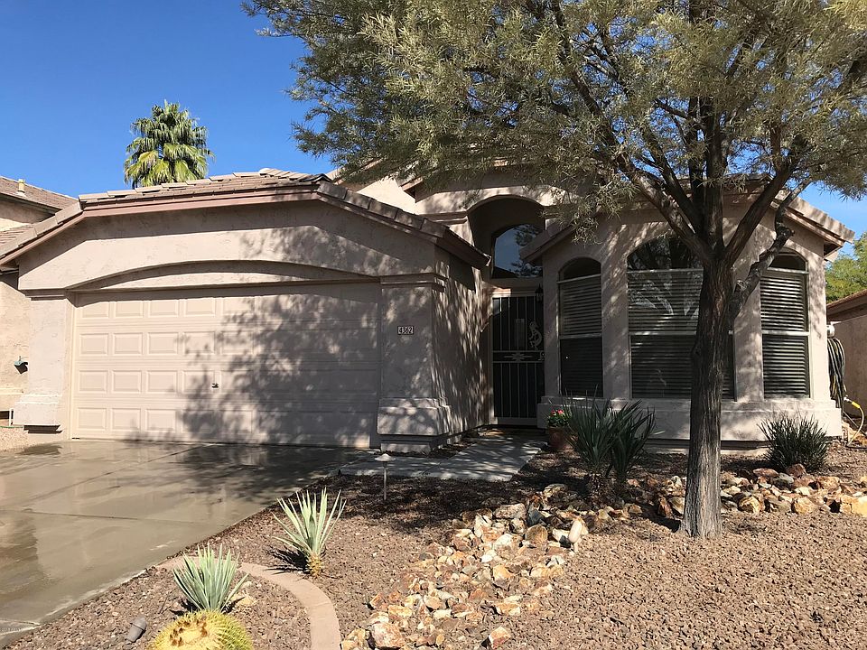 Desert Ridge living at its finest. Travertine floors throughout and neutral colors make this home move-in ready. The kitchen features custom cabinets with detailed molding and stainless appliances. You’ll love cooking on the natural gas range and saving on your utility bills with the gas dryer and water heater. Custom cabinets continue throughout for added storage in the laundry room and master bath. The home features a formal dining room and living area for indoor entertaining. Master suite includes a huge walk-in closet, granite counters, double sinks, and separate backyard access. Garage has water softener loop, storage cabinets, and an overhead storage rack. Backyard has an extended patio for outdoor entertaining, mature citrus tree, low maintenance landscaping & artificial grass.