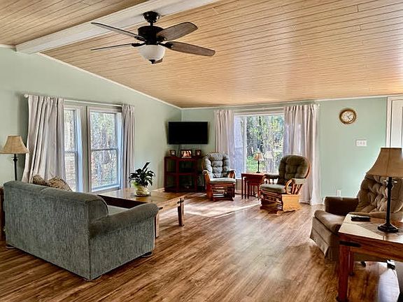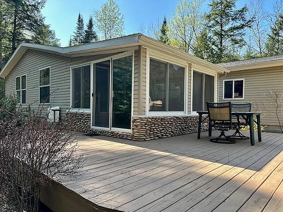 Escape to your own private oasis on 3 lots nestled in the tranquil woods. This updated home boasts modern touches and a sharp year-round sunroom that leads out to a wrap-around deck. The sunroom can even be used as a 3rd bedroom. The newly dressed owner's bath features a charming cottage motif with beadboard, attractive tile, and double sinks. Enjoy an open floor plan highlighting the sunny kitchen with newer stainless appliances, ample dining space, and vaulted ceilings that make the living room feel spacious. Conveniently located near the bedrooms and garage entrance, the laundry makes life a breeze. Take advantage of platted walkways leading to Mullett Lake access (access for owner only NO Airbnb access) and indulge in the nearby walking, biking, and snowmobile trails. This home features a circle drive, 2.5 car garage, and 2 sheds for storage of patio furniture and garden tools. Act fast - short occupancy and top consideration for lenders and cash buyers. Sellers require preapproval stating approval for a HUD/manufactured home. See private notes for more information.