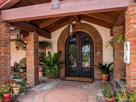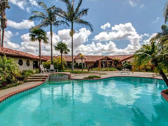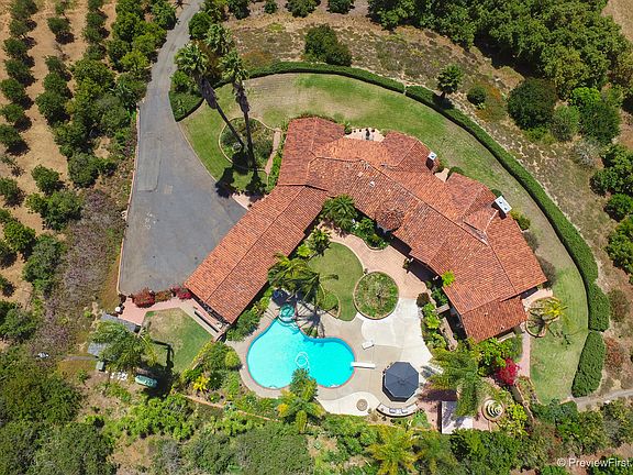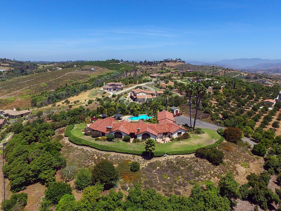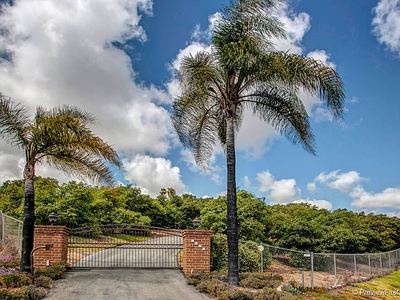 Custom Spanish Mediterranean Estate Exquisite, private gated estate on 4.2 view and usable acres. Wonderful open floor plan for entertaining or just living. Newly remodeled chef's kitchen with custom quartz counters. Four bedrooms, 3.5 baths, Wood beamed ceilings, banks of French doors with custom iron detail, Court yard with beautiful covered veranda, several water features, and pool and spa. Totally fenced, gated, RV parking, grove with 300 avocado producing trees. Citrus trees, Secret garden and more!