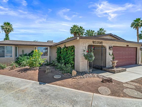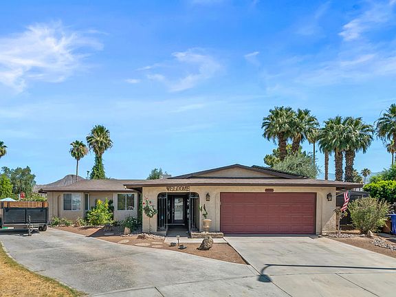 Prime Palm Desert location. Close to schools, shopping and entertainment. This 4 bedroom 2 bath home has been updated and ready to move! And it's on a cul-de-sac with an oversized lot The yard has a gated, private pebble tech pool, surrounded by beautiful landscape that gives it a tropical oasis vibe and is south facing. Great covered patio and fruit trees. Save on electric with the solar system! Side driveway for RV parking with 50 amp outlet. The house also has great storage, with new electrical panel and a good sized side gardeners work area that includes out building, outlets and water! Newer 100 amp sub panel in garage. House swamp cooler and more! Beautifully landscaped!