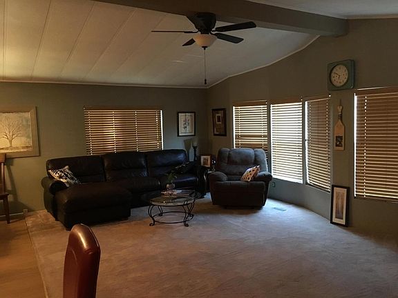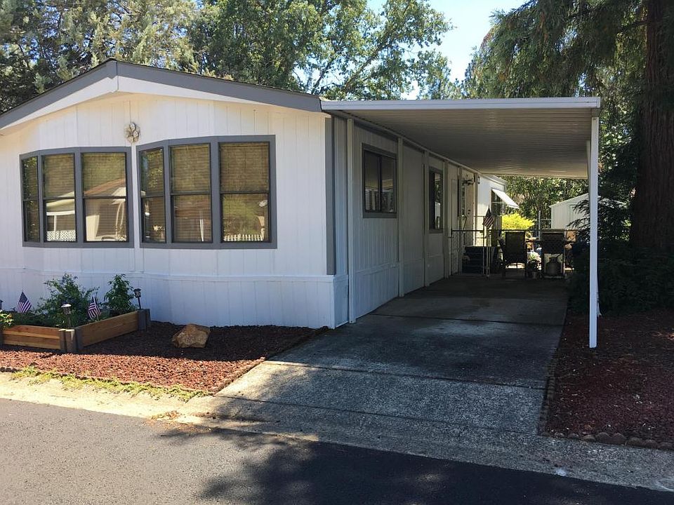 Nice unit on tree lined street in an all age park. Large covered deck and carport with separate storage unit in desirable location within park. New roof and seller has just painted interior, redone kitchen and bathrooms. New blinds in living room. Recently painted exterior.