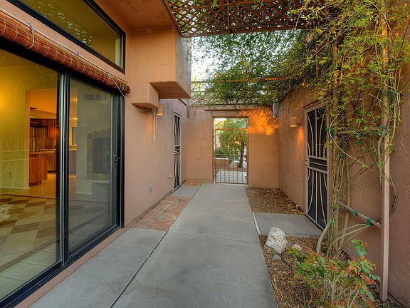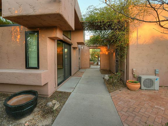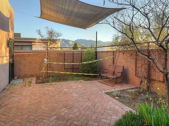 Unusual, charming Town and Country I free standing townhome w/free standing garage on a large lot. Vine cover trellises offer shade from entry gate onward. Lush growth & brick walkways connect 3 spacious patios. Privacy & views of Catalina Mtns. thruout. Interior is light-filled, high windows & ceilings allowing lovely views. Dining rm & Living area w/fireplace. Upgraded kitchen w/granite counters, stainless steel appliances & newer cabinetry. Big pantry/laundry rm, Master bedrm has ensuite bathrm, walkin closet, sliders to the interior courtyard. 2nd bedroom was expanded, 3rd bedroom has been used as an office. Each bedrm has access to a patio. Backyd has wrap around fully covered patio. Heated & cooled 2 car garage! Catchment for rain runoff. Community pool! Steps from the Riverwalk.
