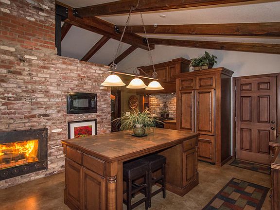 One acre in the city!! This ranch style home has so much character! Open beam vaulted ceiling, newer windows, new roof. Used brick walk in shower in guest bath is so cool!! Enjoy the double sided used brick fireplace that warms the entire house with it's special recirculating system. Kitchen remodel with island and lots of storage. Appliances have cabinet fronts, including refrigerater. BIG POOL!