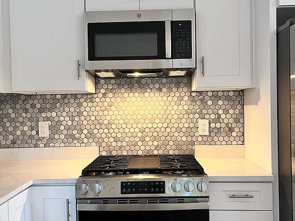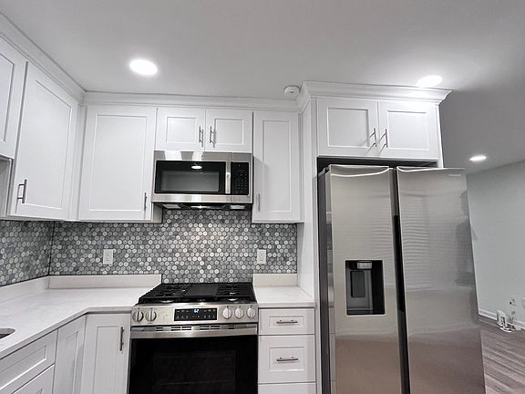 * Remodeled kitchen: white cabinets, quartz countertops, smart stainless steel appliances, garbage disposal, stylish backsplash