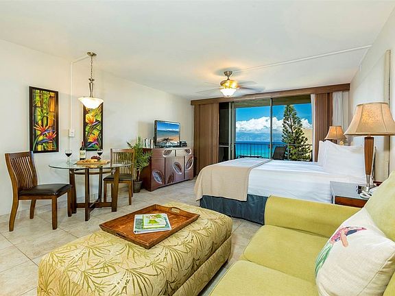 Nicely remodeled and tastefully furnished with very good Ocean views. This is the closest location to the Ocean for Studios on the cool side of the Building with the orientation of the Bed facing the Ocean. There is an abundance of upgrades with quality finishes and attention to detail. The unit has been completely upgraded with tile flooring, Cherry cabinetry, granite counter tops, custom shower, all appliances including Dishwasher and Washer/Dryer. Unit has central Air conditioning and is on the cool side of the building with abundant Trade winds. This condo is located on Kahana Beach with an excellent Ocean side heated pool and large deck area with adjacent Bar b Que that has been recently renovated. There is an Exercise room and covered parking on the lower level. It is conveniently located within walking distance of 6 Restaurants, shops, convenience store, gas station, activities and beach equipment rentals and a short drive to additional beaches and activities in Kaanapali and Kapalua. Look forward to walks on the beach, a front row seat to Whale season and just relaxing to the sounds of the surf and the breezes through the trees. The unit has been self-managed for vacation rentals with strong performance. Association fees cover everything including electric, air conditioning, Cable and Internet provided in addition to all other utilities, common area maintenance, Insurance and Reserves.