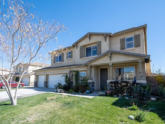 A Lancaster beauty you are sure to love! This Two-story home features a floorplan with 5 bedrooms, 4 bathrooms and 3,090-SqFt of living space. The home has beautiful flooring, ceiling fan/light fixtures, central AC and lots of storage space. It is a bright and spacious home with a living and dining room, a bonus room and a family room! The bonus room can be great for a den, office space or a playroom. Enjoy creating meals in a beautiful kitchen complete with sleek tile countertops, nice built-in appliances, as well as a center island that is perfect for extra cooking space and recessed lighting too. Adjacent from the dining area and the kitchen is a large family room that comes with a fireplace. The first floor has 1 guest bedroom and a guest bathroom, along with a convenient laundry room. On the second floor you have 4 bedrooms, that includes 1 Primary Retreat bedroom. Enjoy relaxing in the HUGE primary retreat bedroom featuring a double door entry, an additional area with a fireplace, plus a walk-in closet and an en-suite bathroom equipped with a double vanity sink, standup shower and a soaking tub. The room includes a private balcony with a mountain view. 2 of the bedrooms share a Jack and Jill bathroom. The 4th bedroom has a bathroom in the hallway. The property has PAID off solar panels and an attached 3-car garage with direct access into the home. You and your guests will enjoy the private backyard offering lush greenery with roses and fruit trees that blooms bright in the spring and a large covered patio where you can add outdoor seating. Located near Gregg Anderson Academy, the Prime Desert Woodland Preserve, Antelope Valley College, markets and more!