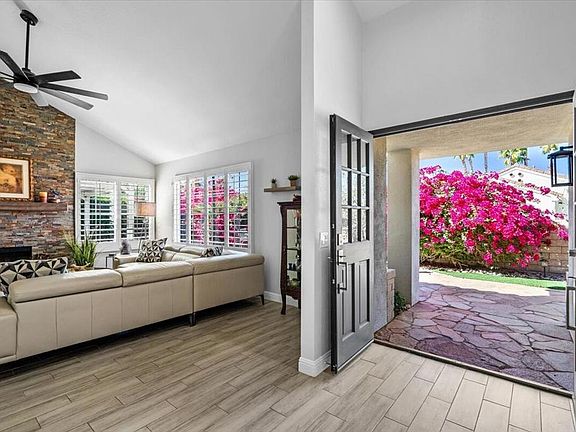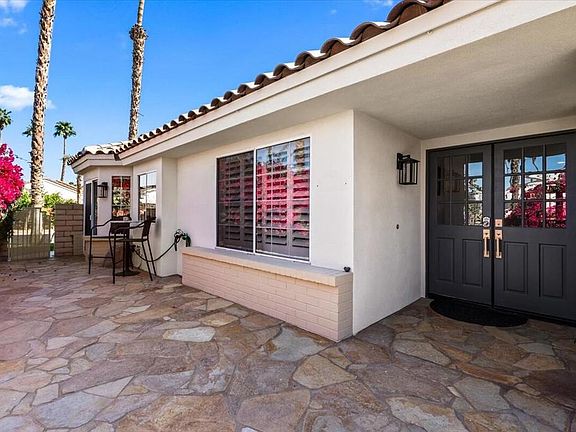 Welcome to this beautifully remodeled, corner, detached home in the highly coveted Desert Breezes Resort, just a short stroll from the Indian Wells Tennis Gardens. This stunning property is perfectly positioned in a quiet, serene interior location, next to one of the community's six pristine pools and spas. Enjoy the luxury of a poolside retreat without the hassle or expense of pool maintenance!Step outside to a lush, wraparound patio, featuring flagstone flooring, multiple seating areas, and vibrant bougainvillea, that adds privacy and charm. Inside, the expansive living room features soaring ceilings, abundant natural light, recessed lighting, and a striking stackstone fireplace. Adjacent to the living room, a wet bar is perfect for crafting cocktails for family and friends. The modern ceramic wood tile floors throughout the home enhance its clean, contemporary feel. The formal dining room offers ample space for intimate dinners or larger gatherings. The chef's kitchen is a standout with ample storage, a modern backsplash, a gas cooktop, and top-of-the-line stainless steel appliances. A sunny breakfast nook provides a cozy space for casual meals, flooded with natural light. The generously sized primary bedroom is a true retreat with high ceilings, sliding glass doors that open directly to the private patio, and a tranquil atmosphere. The newly remodeled en-suite bathroom offers double sinks, a soaking tub, a spacious walk-in shower with a glass enclosure, and a separate water closet. The large walk-in closet provides ample storage. Two guest bedrooms are thoughtfully placed for privacy and comfort, with a beautifully remodeled guest bathroom nearby. The attached two-car garage features ceramic flooring and abundant storage, with an indoor laundry room adding convenience. Desert Breezes Resort boasts a low HOA fee and offers impressive amenities, including tennis and pickleball courts, a fitness center, a clubhouse, scenic walking paths, and six pools and spas. The community also provides 24-hour security and gated access, offering peace of mind. Lush green walking spaces enhance the tranquility of the community, perfect for jogging, strolling, or relaxing while knowing your safety is a priority.The location is ideal, just minutes from premier shopping centers, superb dining, and top-rated hospitals and medical facilities. Desert Breezes Resort provides a peaceful, secure environment, offering a perfect blend of convenience and luxury living.