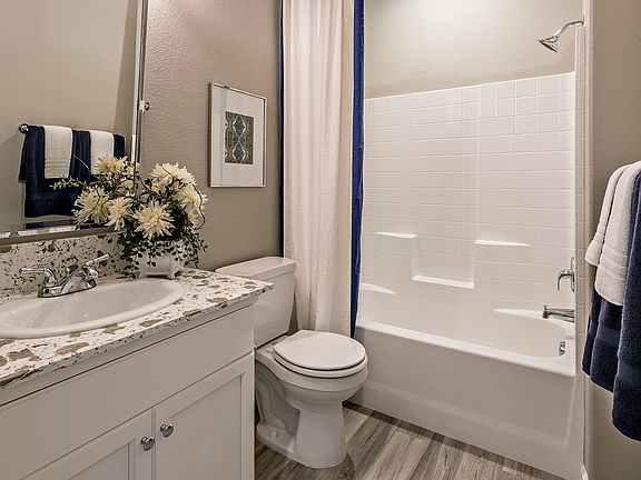 Auden is a stunning single-story home that features an open layout of the kitchen, great room and dining room. The open living space continues to the spacious outdoor area, ideal for dining or lounging. The sizable owner's suite includes a walk-in closet, double sink vanities and a large soaking tub.