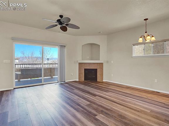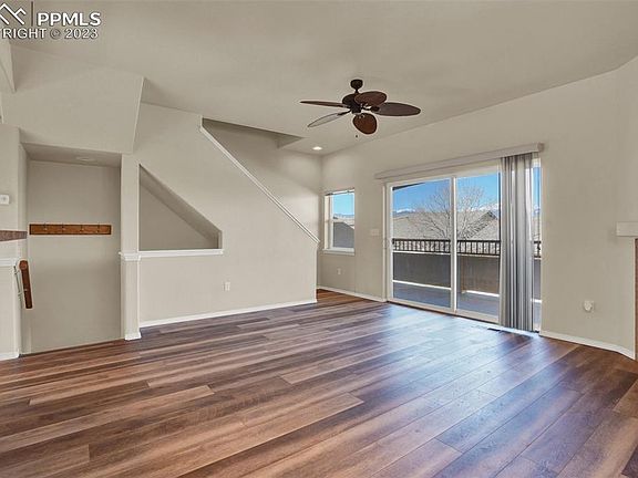 Welcome to a quiet, well-kept townhome community. Enjoy wide views of Pikes Peak and the Front Range from the living room, covered deck, and main bedroom. The back patio butts up to an easily accessible open space with hiking/biking trails. A short walk provides a plethora of locally owned restaurants and shops, and is about a mile away from every bit of shopping one may need. Landscaping maintenance, trash, and snow removal included (see Iron Horse "Rules & Regs." for an impressive list of HOA services). Deep 2-car garage has closeted water heater and recently serviced furnace, as well as abundance of storage with a nook and closet. Upstairs, to the Great Room and kitchen which is a wonderful entertainment space with walk-out access to both the back patio and the covered front deck. The upper level features 2 full bathrooms and 3 bedrooms, all with striking views of natural Colorado beauty.