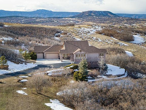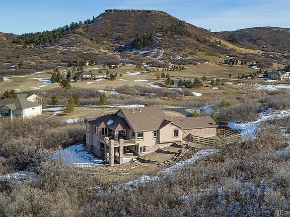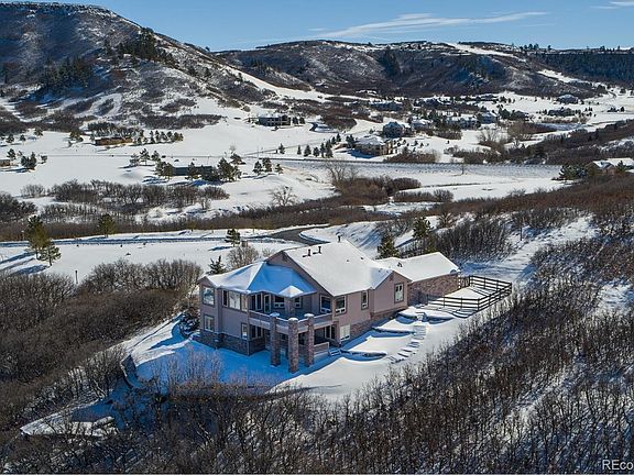 Majestic western facing mountain views from Mount Evans to Longs Peak. Stunning home surrounded by lots of mature trees and located at the end of a cul-de-sac on 5.29 acres; Open floorplan; Gourmet kitchen with gas cooktop stove; newer GE double ovens; stainless appliances; slab granite countertops; center island; Elegant formal dining room; Main floor study with French doors and built-in bookcases; Great room features high ceilings, cozy fireplace, hardwood floors, and lots of windows to feature the views; Luxurious Master Bedroom is complete with a fireplace, walkout to covered Trex deck; Community features over 26 miles of equestrian and hiking trails, and park/playground; Lower level features 3 bedrooms, family room, media room, and wet bar. Country living at its finest, yet only a couple miles to town. Ask listing agent for a list of all the new improvements and upgrades to the home (new furnace, ac unit, stucco, etc.)