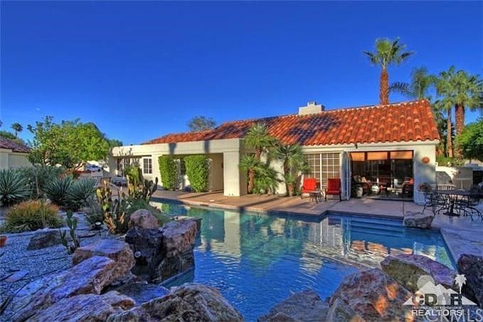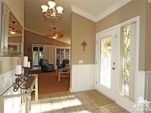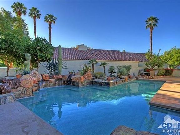 A beautiful pool is featured in the large yard at the end of the cul-de-sac. It is the Amalfi Model with 3 bedrooms and 2 baths. There are custom cabinets and crown molding throughout plus 3 Cedar Closets. Floor to ceiling cabinets and shelves are in the 3rd bedroom and can be used as a Den or Library. There is a 11x15 enclosed Patio Room with folding windows and doors to a view of the Sparkling Pool. There is no traffic noise and a beautiful southern exposure. You can walk to the Indian Wells Tennis Garden and a low HOA Monthly dues of $322.