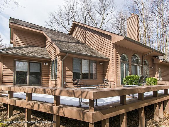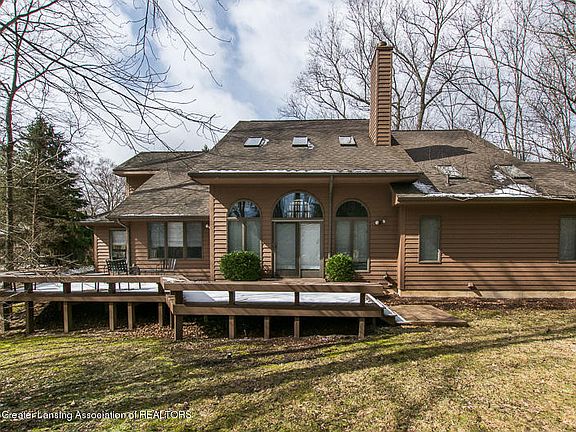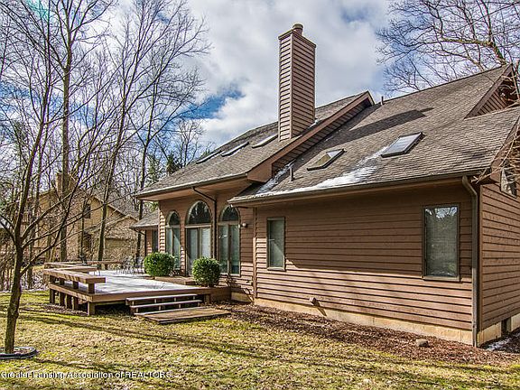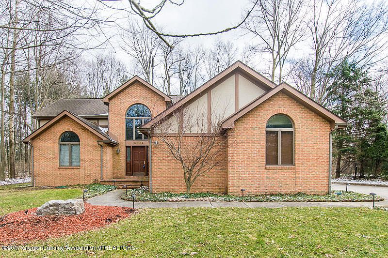 Stunning brick and wood Contemporary Home. Large wrap around deck overlooks woodlands, very private setting. Great Room with 3 skylights, Gas FP, built-inshelves, cherry floor. Dining Room open to the Great Room for easy entertaining. Granite Kitchen with Center Island, Brazilian cherry floor, stainless steel appliances. Breakfast Nook with cherry floor, sliders to the deck. 1st floor Master Bedroom with private whirlpool bath. Den/Office on 1st floor / optional 4th Bedroom. 2 over-sized bedrooms on the second level. Excellent for privacy! 2.5 car attached Garage with cabinets, opener, finished interior. Large basement with high ceilings and lots of opportunity.