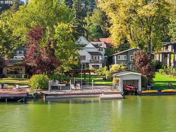 An Autumn Oswego Lake opportunity! Located on Oswego Lake's West Bay with commanding southern exposure this warm and comfortable traditional lives very easily with a flexible floor plan and a large, flat waterfront lot. For the price, this home offers a lot of square footage; large gourmet kitchen, great room, flexible formal or informal dining areas, oversized Owner's Suite with walk in closet, sauna, vaulted ceilings, fire place, patio and optional gym or office area; recreation room with walk in wine cellar, 2 guest rooms and an potting room or flexible space with a roll up door to access the back yard. Long, level, backyard, waterfront patio and boat house. Live that Lake Life all year long!