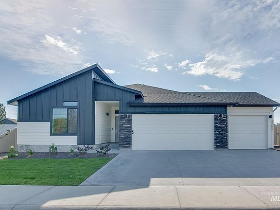 Want to tour this home NOW? Hello Harrison 2025! This home features our gorgeous Warm Grey package including brushed nickel door knobs and all black appliances. A wide open living room that flows into your dining room and a view from the kitchen makes entertaining top notch. The Greek Villa exterior paint and upgraded exterior stone is sure to impress. Double vanity sinks in the master bath with a stand up shower with two seats is such a plus. Walk in closets, square beveled bath mirrors, and crown molding on all upper cabinets, engineered vinyl plank flooring and gorgeous vaulted ceilings in the great room. Also included, our Smart + Safe tech package, keeping your new home safe and sound year round. Come fall in love with the Harrison 2025 today! Home is completed. Photos are of actual home. Fiber for wifi internet is TBD, pending Idaho Power Permit