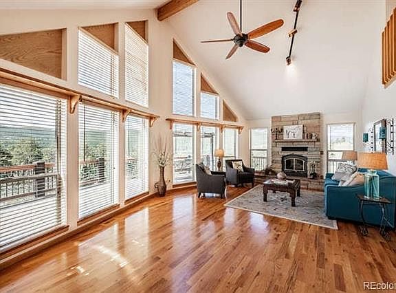 Breathtaking property on 16 gently-sloping acres with tons of usable land offering one of the most spectacular views in Indian Hills. Easy 15-minute commute to C470 & Hampden. Loved and beautifully maintained by one-owner. Open concept floor plan features vaulted ceilings with large south-facing windows exposing sweeping mountain views. Home features hardwood floors, spacious kitchen with giant center island adjoining large dining area and spacious great room with floor to ceiling stone fireplace. Secluded master retreat w/updated 5-piece bath perches atop the home. Spacious family room plus study or 4th non-conforming on lower. Over 4000 square feet of outdoor living space includes wrap-around trex-deck and expansive stamped concrete patio. 2500 sq ft heated shop space w/large overhead doors and an additional two-stall barn with tack room. Extra-large laundry perfect for craft or sewing. Paved Driveway and behind gated community. New roof in 2014. New well in 2017.