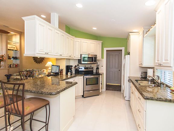 Beautifully remodeled extended capri unit with newer kitchen, granite counters and Stainless steel appliances. Roof is less than one year old. This Capri unit shows like a model and was professionally decorated and is extremely well maintained. Lush Tropical back yard with rock waterfall and pergola. Accordian hurricane shutters. Vaulted ceilings in the great room and enclosed florida room. Sought after gated community with low HOA fees, 24 hour guard & community Pool & tennis. Most furnishings available for sale.