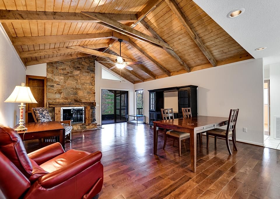 This charming home with an open floor plan has been recently upgraded with numerous features, including a new refrigerator, dishwasher, butcher block countertops, shower head, interior paint, light fixtures, and fresh carpet in the bedrooms. The great room boasts cathedral tongue-and-groove ceilings and a stunning stone wood-burning fireplace, creating a warm and inviting atmosphere. Luxury vinyl plank flooring adds elegance to the great room, while ceramic tile enhances the kitchen and dining areas. The spacious kitchen features a convenient breakfast bar, and the dining room offers plenty of space to host family and friends. The split-bedroom layout ensures privacy and comfort for all. Step outside to relax on the screened porch or deck while listening to the soothing sounds of a babbling brook—perfect for unwinding after a long day. The basement includes a workshop area and a large one-car garage, providing ample space for hobbies and storage. This home is designed for comfort, style, and practicality—your ideal retreat awaits!