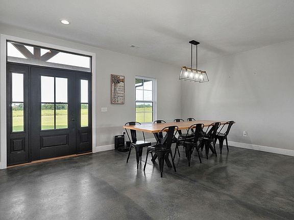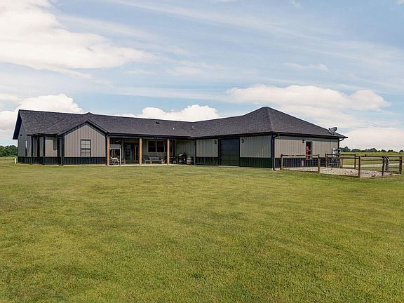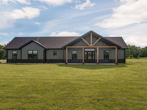 Stunning custom-built home on 5 acres in Clever School District! This incredible one-level home offers 4 bedrooms | 2.5 bathrooms | MASSIVE 3 CAR GARAGE and more! Modern combination of metal siding and shingled roof makes a statement! Upon entry you are wowed by the high ceilings, open floor-plan, stained concrete flooring and the kitchen of your dreams! The heart of the home aims to capture yours. Massive island, double ovens, granite countertops, vent hood, walk-in pantry, a bank of windows and TWO dishwashers flanking an undermount sink! The cabinetry offers the best storage solutions with an abundance of drawers. The island features extra deep drawers to organize even your tallest items. Natural light pours in from all angles. The living room offers a fireplace, vaulted ceiling, multi-directional fan and incredible views with quick access to the covered back porch. Dining space offers a new pellet stove. Split bedroom floor plan allows the primary suite to enjoy the solitude of the peaceful setting. The ensuite has a soaking tub, walk-in shower, dual vanities and an unbelievable walk-in closet with built-in storage. Laundry rooms is equipped with all you could need including a large folding table and laundry sink. Keep life organized with the custom built-in lockers and nearby storage closet. The three bedrooms that reside on the other side of the home all offer built-in storage solutions within the closets as well. Lovely hall bathroom with dual sinks. Getting back to the garage space. Calling it a 3-car garage does not do it justice. Think hobby area, play space or entertainers dream offering a half bath and coming in at over 1300 sq ft! Entire house has spray foam insultation including the garage. Not to be overlooked - the front porch offers the most terrific view for appreciating the sunset! This is one you do not want to miss.