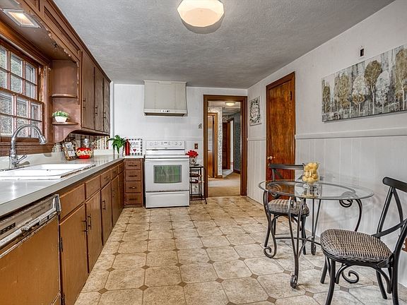 This BRICK EXTERIOR RANCH house is going to surprise you with the ample space and peaceful back yard on almost 1/2 ACRE LOT. 3 roomy Bedrooms, large Livingroom, hardwood floors, 1.5 baths, enclosed porch and a huge finished REC ROOM in basement w/woodstove & BAR for Football watch parties! Lots of storage closets & cabinets inside, and outside garage has an extension perfect for Workshop, and there's a shed. The Boiler is appx 10 years old & Hot water Tk appx 8 yrs old.Property needs some updating, but a great place to gain equity value with your improvements.