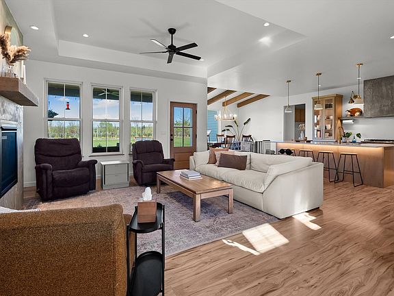 A versatile bonus room, currently used as additional guest seating, offers endless potential as a home office, media room, or playroom. The open-concept kitchen is a true centerpiece, featuring Quartz countertops, a walk-in pantry, 48” gas cooktop, double ovens, custom cabinetry, a built-in coffee bar, and elegant under-cabinet and toe-kick lighting. Expansive Andersen windows frame the mountain views, while exposed real timber beams, featured throughout the home, add warmth and character. An 8’ solid French door and a cozy gas fireplace enhance the inviting atmosphere.