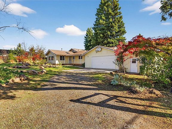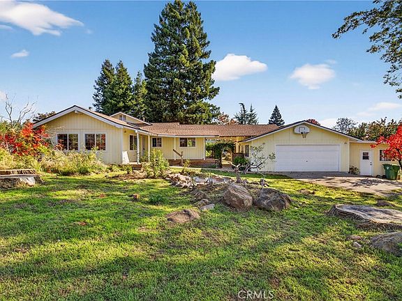 Wonderful Lower Paradise Location for this 1800 square foot 3-bedroom 2 bath home. This area has a great country feeling. 2025 New Roof. Fully fenced and lined with mature landscaping this property captures the essence of traditional paradise living. As you enter the gate you are invited in amongst the trees to a private park like 1.03 acre setting that is overflowing with Life. Just a few of variety of trees found on the property are cedar, birch, cherry, apple, fig, almond, Japanese maple, lemons, cactus and beautiful mature redwood trees. The covered front porch has a warm and inviting feel. The front door invites you into the focal point of the living space. The living room offers vaulted knotty pine ceilings, free standing wood stove, dual pane windows and skylight all works together to create a cozy living room to gather with friends and family. On the north side of the home the hallway leads the way to a spacious guest room as well as the Primary suite. The generously sized primary has dual pane windows, slider to backyard and walk in closet. The primary bath offers claw foot tub, walk in shower and solid surface dual vanities. The sliding glass door opens up to rear landscape and a unique feature you will certainly love. The circle of redwoods creates a unique space to enjoy your early morning coffee, or a star lit sky. At the south end of the home you will find the kitchen, dining, built in linen storage, guest bathroom, and the 3rd and final guest bedroom. The third bedroom benefits from a walk in closet and unique built in space. Reading nook, play area or a quiet place to study are just few of the options you can choose from. Just off the dining room, the covered breezeway leads you to the 2 car Garage. Built in storage, laundry plenty of room to work. At the far end of the garage the enclosed bonus space measuring 13'.8 X 21'.5 and 220 plug and dual pane windows expands your storage or additional living space needs. If you have been waiting for a charming home with room to roam in a park like setting this home is an absolute must see.