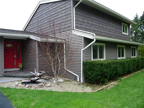 Looking for a little bit of land in Fairport ***Virtual Tour available.*** This contemporary home has over an acre for you to spread out & social distance. It boasts a large eat in kitchen/GE Monogram appliances, granite, cabinets w/pull out shelves & beautiful view. Step thru slider onto the spacious deck & walk to your inground heated pool. Relax in your special hot tub room overlooking the woods. Stainless steel barbecue pit is perfect for your entertaining needs. The large outbuilding houses pool filter/heater & can be a great place for "projects". It overlooks a covered outdoor multi-use space. This private lot is close to amenities. Great room has wonderful hardwood floors & towering stone wood-burning fireplace. Large picture windows allow a great view of the pool. The master suite is the ENTIRE second floor. 3 more bedrooms on 1st floor. Basement is partially finished with a stone fireplace in the game room flanking the pool table. Convenient double bulkhead doors make moving things in & out of the basement very easy. The hardwood floors are gleaming throughout. 1st floor office & 1st floor laundry. Large heated garage has plenty of space for storage & workshop.