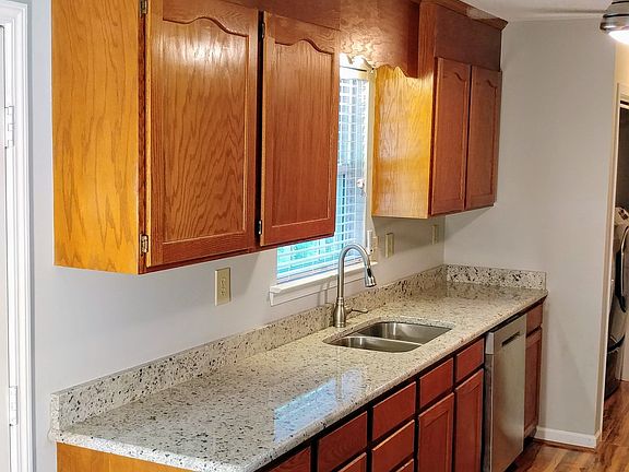 Move In Condition!! COMPLETELY Remodeled Full Brick and vinyl Ranch featuring new Flooring and fresh paint throughout entire home, new Kitchen Granite countertops, SS appliances including Washer and Dryer, new bathroom countertops, new garage door opener and new Roof! New Ceiling fans throughout adorn the 3 bedrooms. Refinished deck is perfect for a backyard BBQ and relaxing with family. Covered front porch provides view of beautiful front lawn. Heat pump 2014