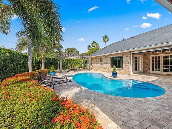 Your Paradise Near the Beach in The Sanctuary! This stunning pool home was designed for you to live the ultimate Florida lifestyle! The lushly-landscaped, fenced backyard features a 22'x24' truss-covered outdoor entertaining area with a summer kitchen, large pool, and a pergola w/ gas hook-up for a firepit. Architectural details abound with coffer ceiling, french doors, and gas/wood fireplace with built-ins. The chef's kitchen has high-end appliances including Wolf 6-burner gas range, wine cooler, and Sub-zero refrigerator, custom wood cabinetry with pull-outs, huge island, & breakfast nook. Spacious Primary Suite with Jetted Garden Tub and walk-in shower. Full Brick! New Roof 2019. New interior paint. Community Pool, Clubhouse & Tennis Courts. Walk/bike to the beach. A-rated Schools.