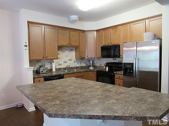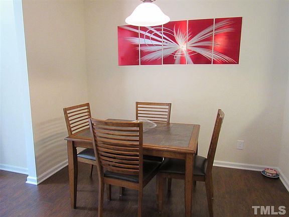 Very nice 2 story, 3BR/2.5BA townhouse with an attached 1 car garage. Beautiful hardwood style laminate flooring throughout the 1st floor. Home features an open floor plan with a great kitchen with plenty of counter space and cabinets and a tankless water heater. Refrigerator, Washer and Dryer Convey. The home backs to a wooded buffer area. Community Pool and Playground. Great location! Close to 55, I-540, RTP and shopping. Agent related to seller.